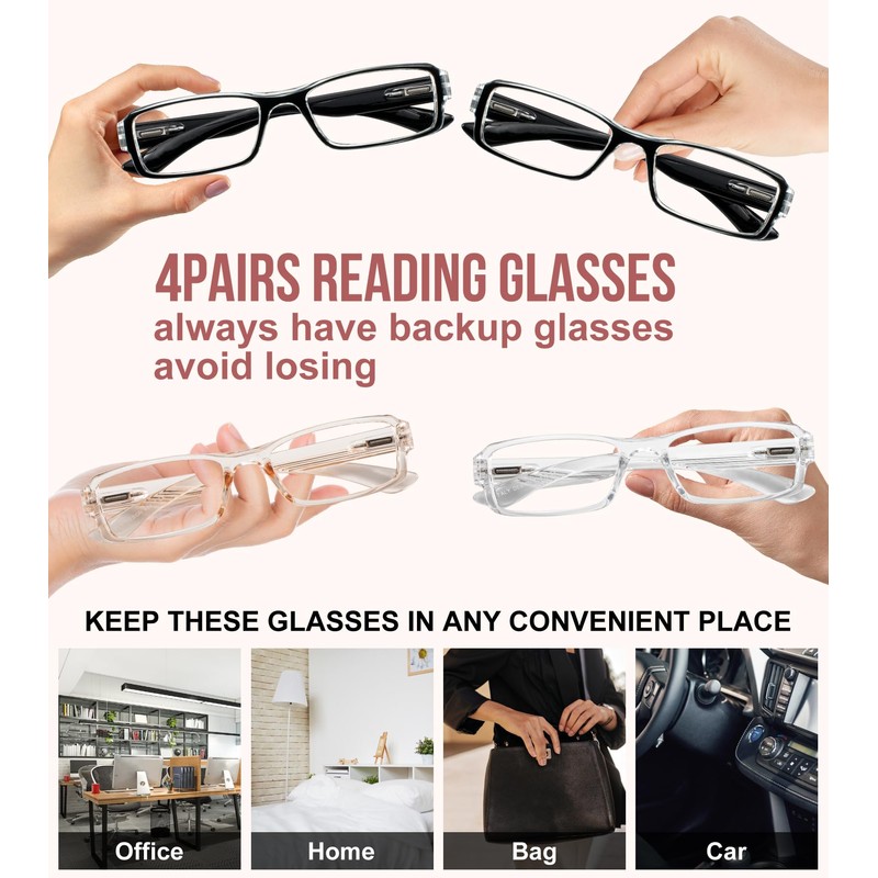 - [4-Pack Convenience] Never worry about losing your reading glasses again! With valuable set of 4 pairs, you can keep a pair in every convenient place. Stash them in your office desk, by your bedside at home, in your handbag for on-the-go use, and even in your car. Always have a backup and enjoy seamless vision wherever you are