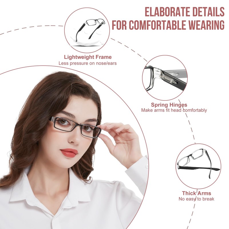 - [Comfort-Focused Design] Lightweight Frames: The lightweight readers 4.0 puts less pressure on your nose and ears, allowing for all-day comfort. Spring Hinges: These hinges ensure a perfect fit, adapting to the shape of your head for maximum comfort. No more uncomfortable pinching or slipping. Thick Arms: Durable and sturdy, the thick arms are built to last and won't easily break, even with daily use