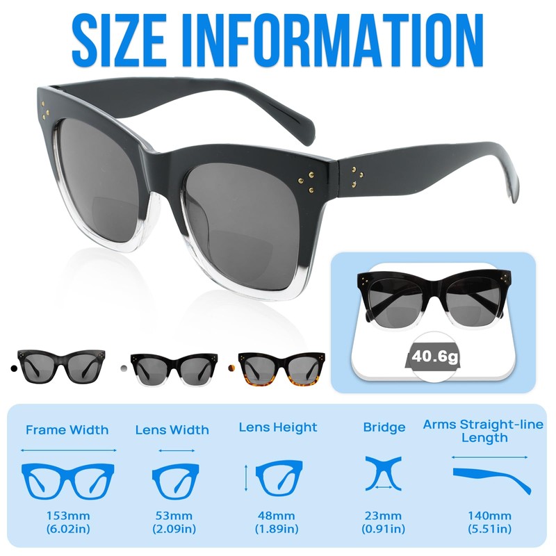 - [ Fashionable oversize design ] Large bifocal sun reading glasses with thick frame make a bold and stylish looking. Ideal fashion accessory to show your personality. Lager frame size fit various face sizes to crate different style of looking.