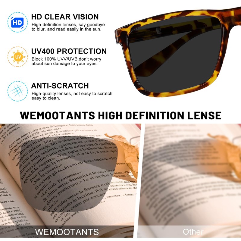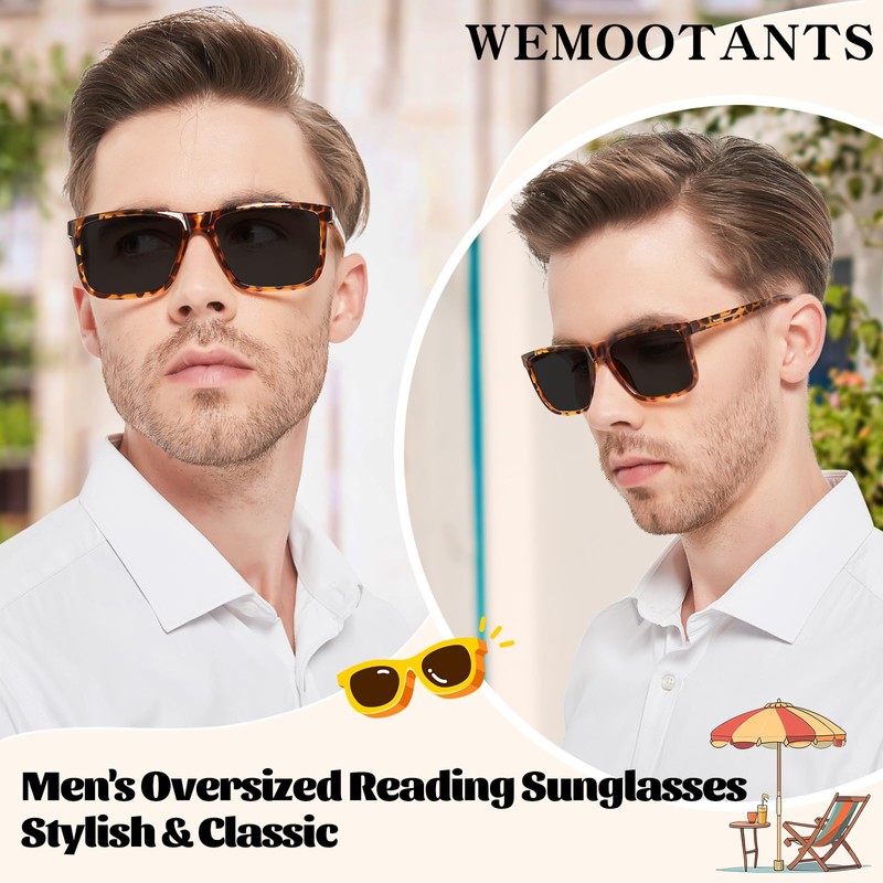- Full Lens Reading Sunglasses - Do you enjoy the outdoors and reading? WEMOOTANT men's large reading sunglasses 1.25 with 100% UV400 eye protection are the best choice for reading outdoors. The lenses effectively filter and block glare for a naturally clear visual effect even in the sun, and you can take them on camping, hiking, biking, vacations, and more.