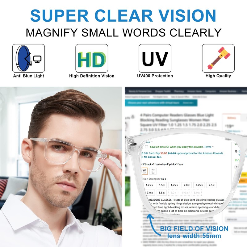 - BIG VISION FIELD FOR READING - Large reading glasses offer wider clear vision field, greatly reducing blind point, convenient for reading or doing detail works. Large blue light filtering readers offer bigger eye protection covering area. Large glasses frame offers more comfortable fit to big head sizes.