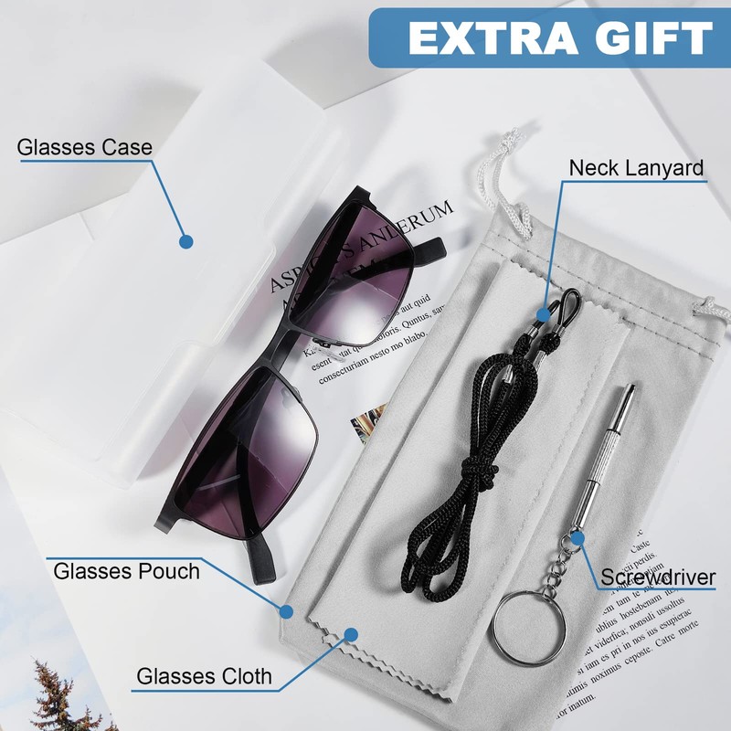Extra Gift & Customer First - You will get Reading Sunglasses Men 100 *1; Sturdy Case *1; Microfiber Pouch *1; Glasses Cloth *1; Screwdriver *1; Neck Lanyard *1.