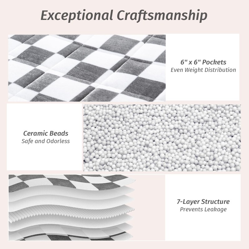 - Exceptional Craftsmanship: This checkered weighted blanket is designed with a 7-layer structure, filled with premium ceramic beads and soft layers to prevent leakage. The 6"x6" small pockets ensure the beads are held in place, maintaining even weight distribution