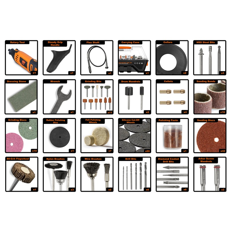 Remember when you had versatility and power all in the palm of your hand? Remove rust from rusty stuff. Trim your dogs toenails. Engrave beautiful images into your neighbors windows while theyre vacationing in Rome. With the WEN Rotary Tool the possibilities are endless, limited only by your imagination and federal law. Equipped with over 190 accessories, this package provides a wide variety of bits and discs to meet the needs of any project. Variable speed can be set anywhere from 8,000 to 35,000 RPM with the simple turn of the speed dial. The handy carrying case makes transportation and storage easier than ever while the lightweight 1.3-pound body limits fatigue during operation. Versatile collet selection allows for bits anywhere from 1/32 of an inch to 1/8 of an inch in size. The removable steady-grip handle provides an alternative method for holding the rotary tool. Its ergonomic design evenly distributes the weight of the tool along the back of your hand, maximizing comfort during long work sessions. Swap the steady-grip handle out for the included flex shaft to help take on intricate and complex designs in glass, plastic, wood, steel and more. And because it is a WEN product. a stocked inventory of replacement parts, and a friendly and helpful phone line. Carve, cut, grind, deburr, engrave, shape, drill, polish and other verbs all with the WEN Rotary Tool Kit. Remember when you had one tool that could do it all? Remember WEN.