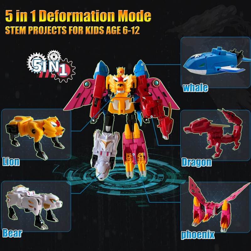 - 【10-inch robot】 The robot consists of five parts, including lion, dragon, whale, phoenix and bear. We can combine them to make a big robot, or assemble them into five different animals. Your child will be surprised at this new friend!