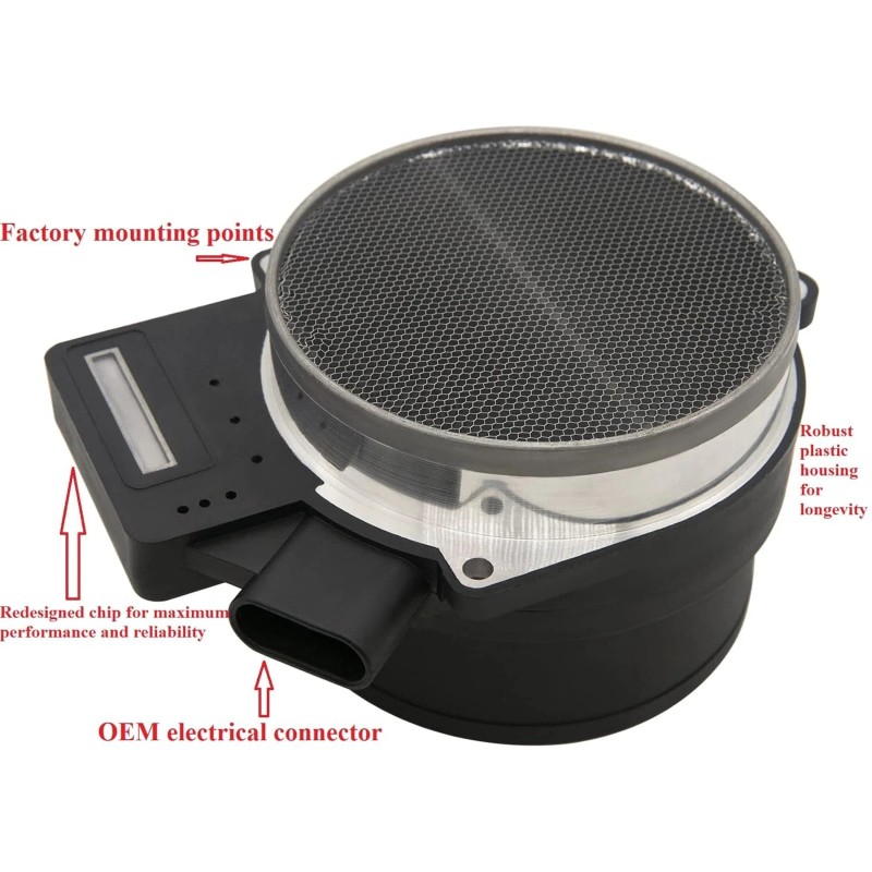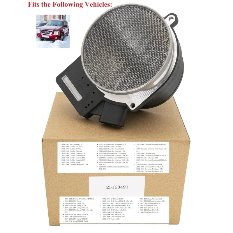 Mass Air Flow Sensor - Compatible with Chevy, Cadillac, GMC & Other GM Vehicles - Silverado, Suburban, Tahoe, Yukon XL, Sierra, Escalade, ESV, 5.3L, 6.0L, 4.8 - Replaces 25168491, AF10043, 25318411 Replaces Part Numbers: AF10043, 258491, 213-4160, ###, 15904068, MF8411, 28411M11, SU11, SU9516 Compatible with Cadillac : 04-07 Buick Rainier 5.3L 04-05 CTS 5.7L V8 GAS 00-05 DeVille 4.6L V8 GAS DOHC 00-02 Eldorado 4.6L V8 GAS DOHC 02-06 Escalade 6.0L V8 GAS 03-06 Escalade ESV 6.0L V8 GAS 02-06 Escalade EXT 6.0L V8 GAS 00-04 Seville 4.6L V8 GAS DOHC Compatible with Chevy 05-07 Chevy Corvette 6.0L 06 Chevy Suburban 6.0L 2000 Chevy Suburban 2500 6.0L 06-08 Chevy Trailblazer 5.3L 06-09 Chevy Trailblazer 6.0L 02-06 Avalanche 1500 5.3L V8 GAS 02-06 Avalanche 2500 8.1L V8 GAS 2001 C3500 8.1L V8 GAS 2001 C3500HD 8.1L V8 GAS 01-04 Corvette 5.7L V8 GAS 99-07 Silverado 1500 4.3L V6/4.8L V8 GAS 01-03 Silverado 1500 HD 6.0L V8 GAS 99-04 Silverado 2500 6.0L V8 GAS 01-04 Silverado 2500 HD 6.0L V8 GAS 01-06 Silverado 3500 8.1L V8 GAS 03-04 SSR 5.3L V8 GAS 00-06 Suburban 1500 5.3L V8 GAS 00-06 Suburban 2500 6.0L V8 GAS 01-06 Suburban 2500 8.1L V8 GAS 00-06 Tahoe 4.8L V8 GAS 01-02 Tahoe 5.3L V8 GAS 06 Tahoe 5.3L V8 GAS 03-06 Trailblazer EXT 5.3L V8 GAS Compatible with GMC 2000 C2500 5.7L/7.4L V8 GAS 2000 C3500 5.7L/7.4L V8 GAS 01-02 C3500HD 8.1L V8 GAS 05-09 Envoy 5.3L V8 GAS 03-06 Envoy XL 5.3L V8 GAS 04-05 Envoy XUV 5.3L V8 GAS 2000 K2500 5.7L/7.4L V8 GAS