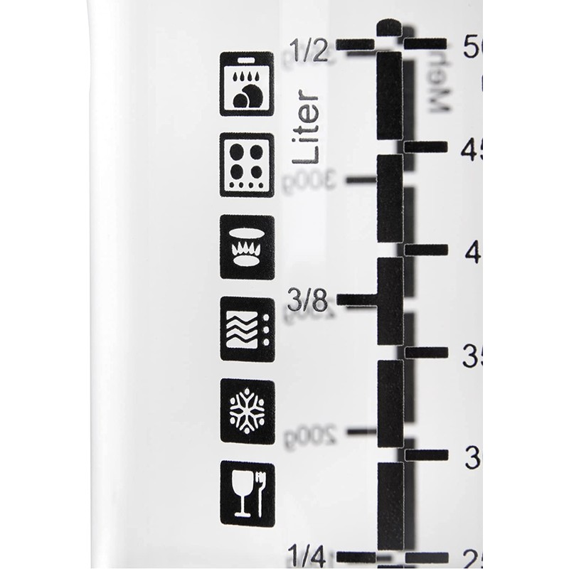 - Various units of measurement for accurate measurements: grams (for flour, sugar, rice and semolina), litres/millilitres (100-500 ml) and liquids (4-16 fl. oz. ), bilingual measuring scales (German, English)