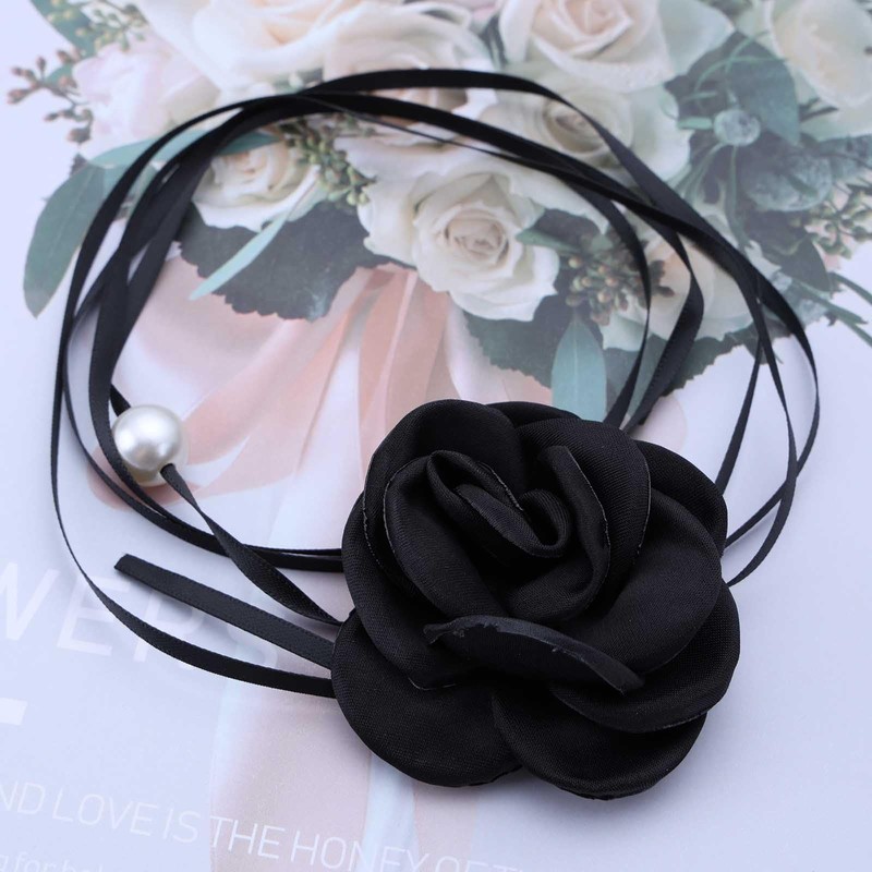 Wendalern Flower Pearl Choker Necklace for Women Black Satin Rose Flower Collar Necklace Long Black Ribbon Velvet Lace-up Necklace Big Camellia Floral Lacing Necklace Bridal Wedding Jewelry
