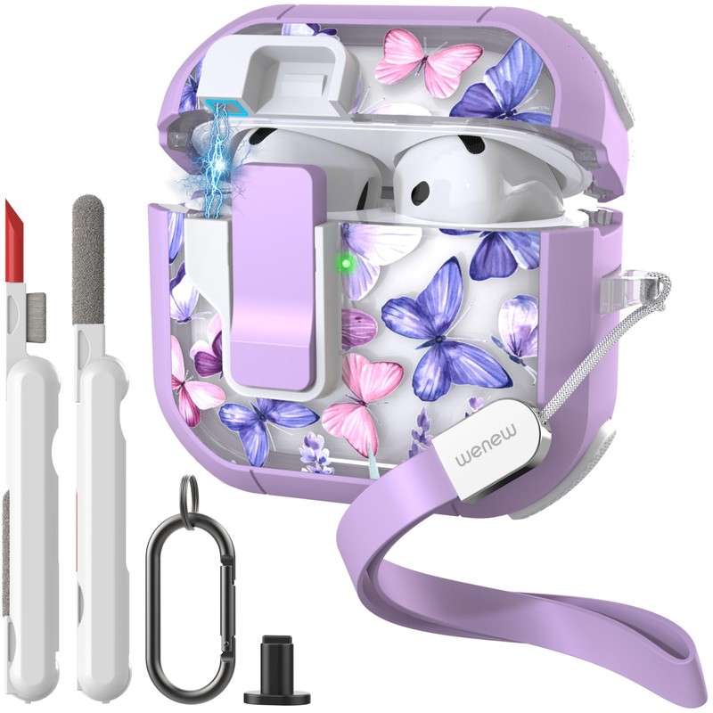 WENEW Case for AirPods 4th Case Cover Secure Lock Automatic Snap Switch Clip Cleaner Kit Lanyard Women Stylish Flower Armor Hard Shell Full Body Front LED Visible (Purple Butterfly, AirPods 4th)