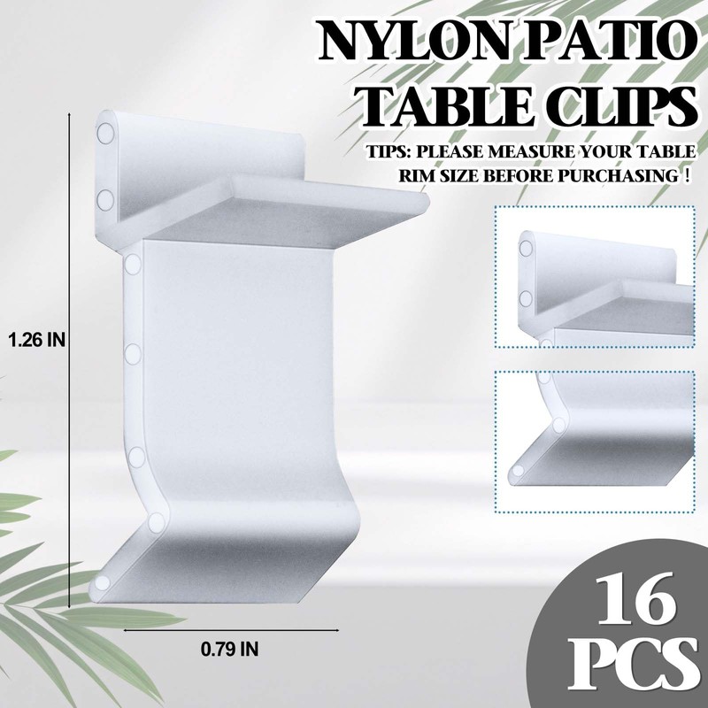 - Widely Used: The patio table rim clip is suitable for supporting glass and acrylic table tops. Nylon table rim clip size is 1.26"x0.79" , fitting most table rims.