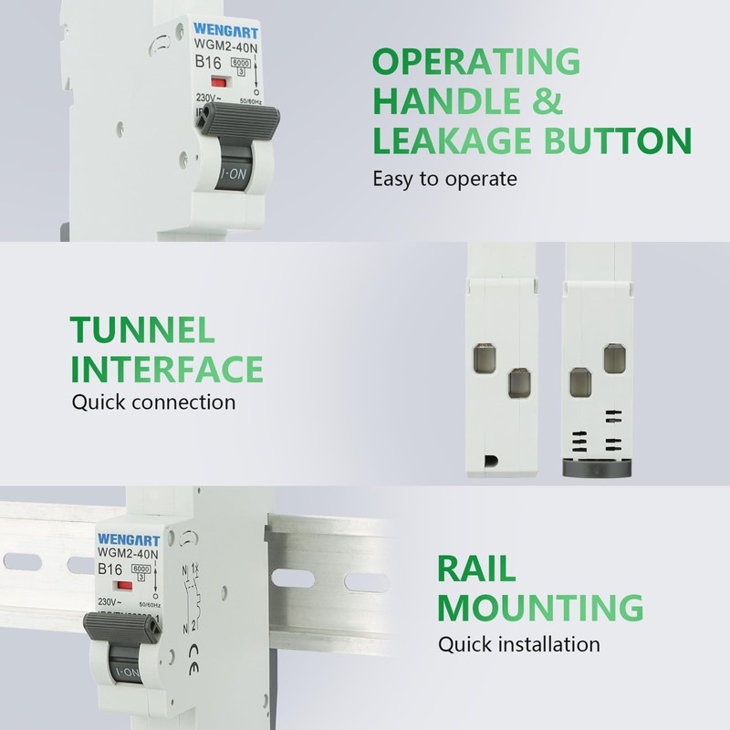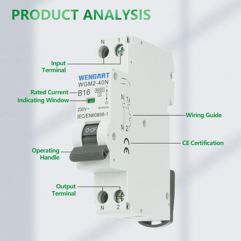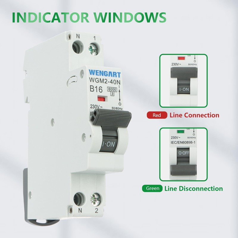 Wengart Miniature Circuit Breaker WGM2-40N, AC230V 16A 1P+N 6kA B-Char, Electrical Safety Switch for Household/Industrial
