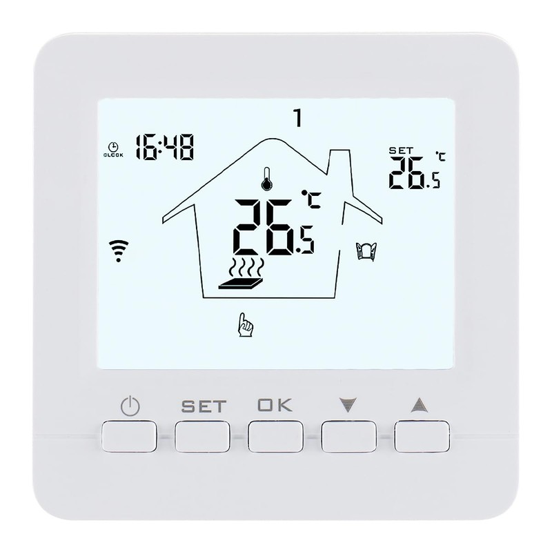- The digital thermostat has an LCD display and the large screen shows the room temperature, set temperature, current heating status and time, which is convenient for understanding the current status of the thermostat.
