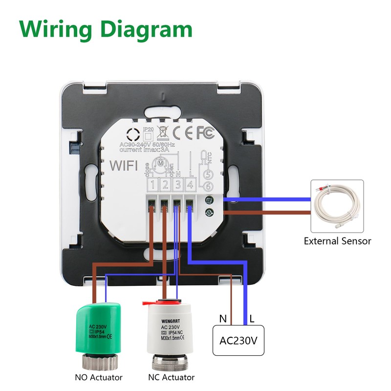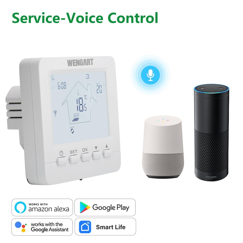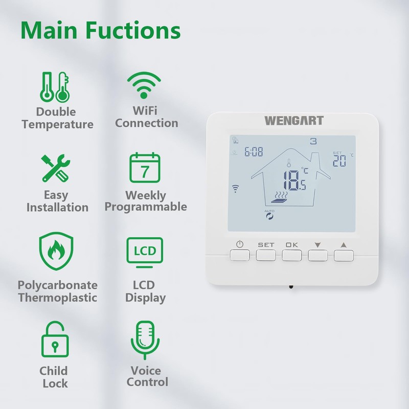 Wengart WiFi Smart Thermostat WG02B05, 2.4 GHz Wi-Fi App TUYA for Underfloor Heating, Compatible with Alexa Echo/Google Home, AC230V Max3A White Backlight