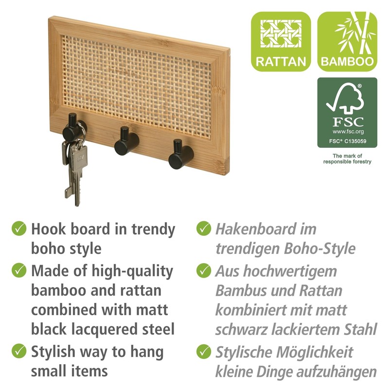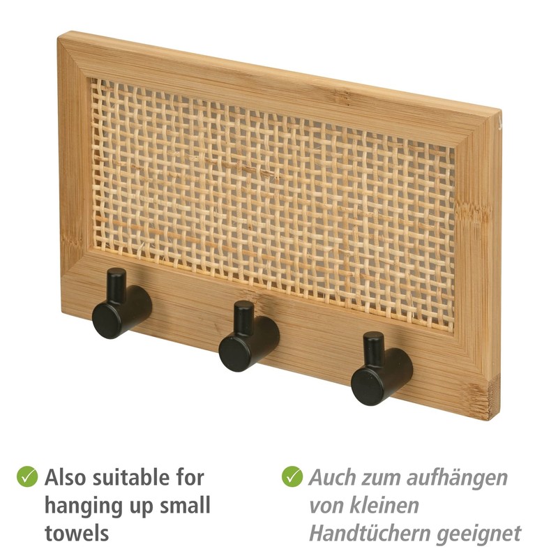 - Trendy bathroom helper: the Allegre hook rail from WENKO sets boho accents in the bathroom and household. The practical hook board is made of high-quality bamboo and a visual highlight made of rattan. The look is rounded off by the 3 hooks made of matt lacquered steel in black.