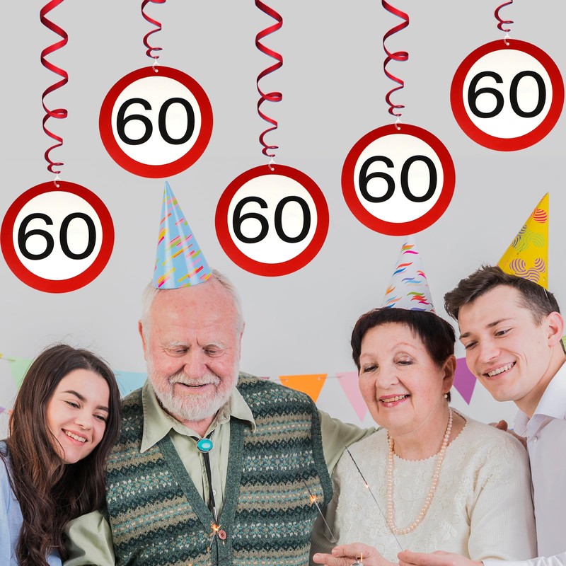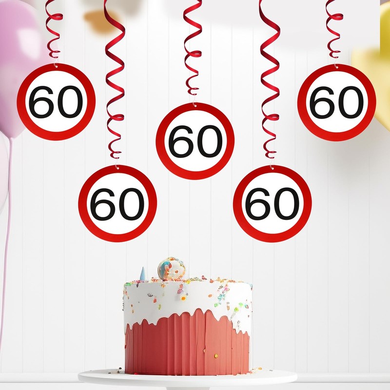 - PACKAGE INCLUDE:5 x 60th Birthday Traffic Sign Garland,5 x Spiral Swirls. (Comes with installation tools).