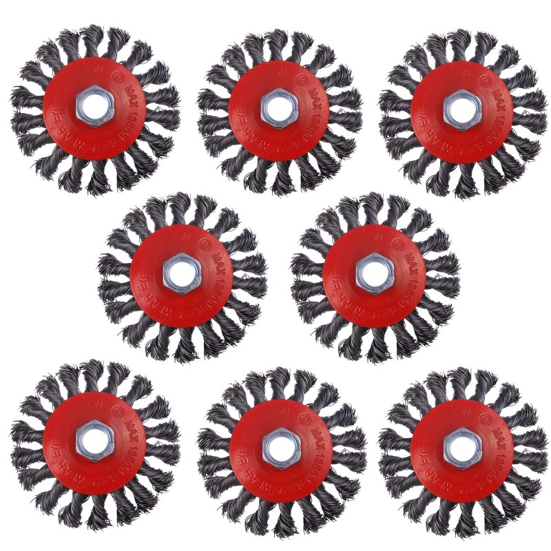 - Specifications: Made of 0.02" 72A twisted carbon steel wire, 4 inch, 5/8" threaded arbor, 12,500 max. speed. Set includes 8 pcs angle grinder wire wheels, ideal for heavy duty cleaning of large metal surfaces and edge fusion.