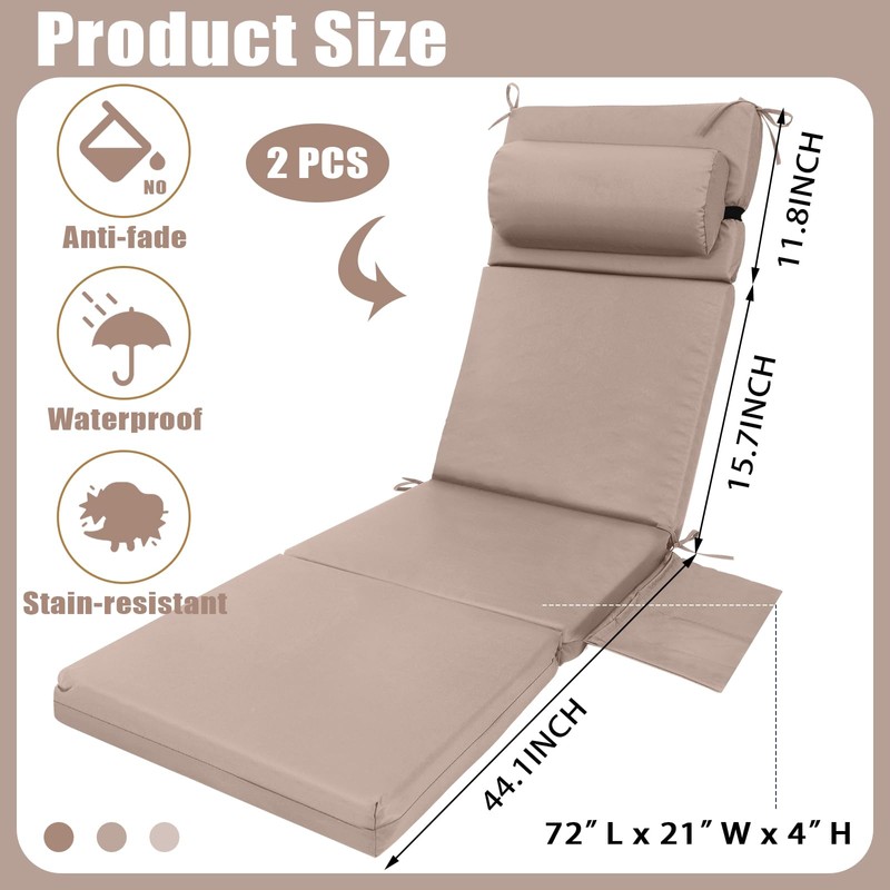 - Suitable Size: with dimensions of 72 x 21 x 4 inches, these outdoor lounge chair cushions are compatible with most standard size recliners; Whether you have a patio, a deck, or a poolside retreat, these cushions will assure rest and relaxation in style