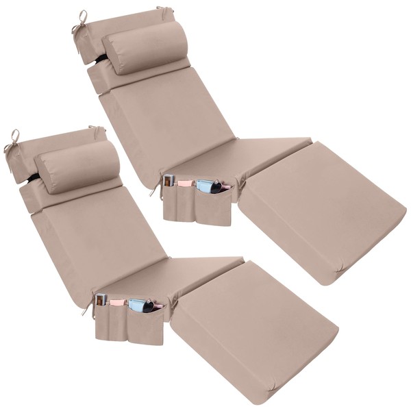 Wenqik 2 Pcs Outdoor Chaise Lounge Cushion with Pillow and Side Pocket Waterproof Lounge Chair Cushions with Pocket on Back 72 x 21 x 4 Inch Patio Pool Replacement Pad (Khaki)