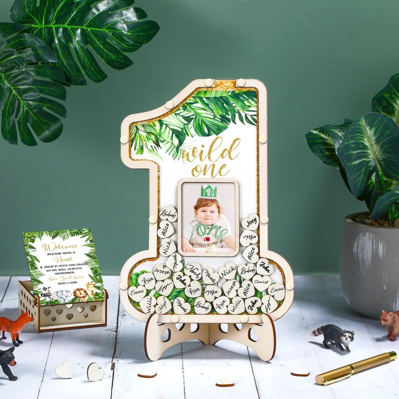 Wenqik 33 Pcs 1st Birthday Guest Book Alternatives 1st Decorations First Birthday Number One Shaped Photo Frame Centerpiece Keepsake with 30 Wood Slices(Wild One)