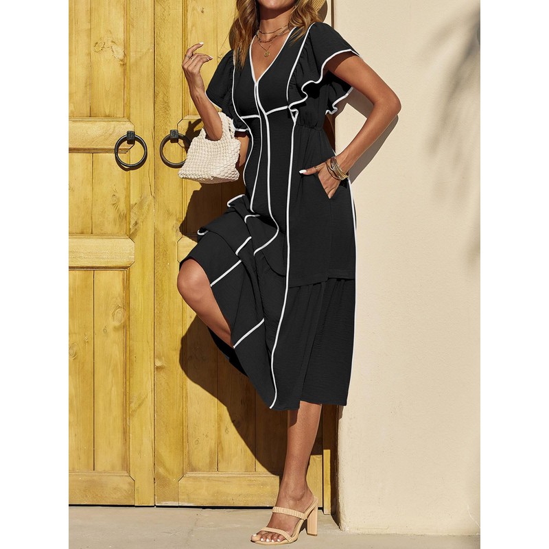 Wenrine Womens Summer V Neck Midi Dress Casual Ruffle Sleeve Contrast Color Loose Fit Flowy Long Dresses Black