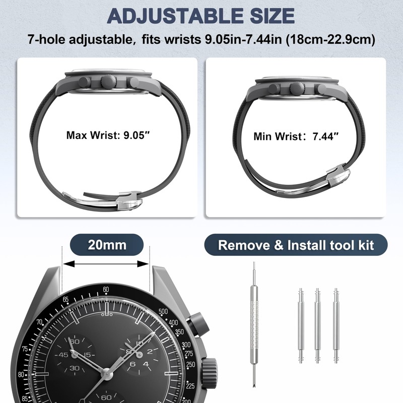 - Fit for Various Watch Brands: Our strap is compatible with a wide range of watches, including Omega Seamaster Speedmaster Omega X Swatch Moonswatch, Rolex,Tudor,Seiko and more. It features a 20mm interface, making it suitable for wrists ranging from 9.05in to 7.44in.