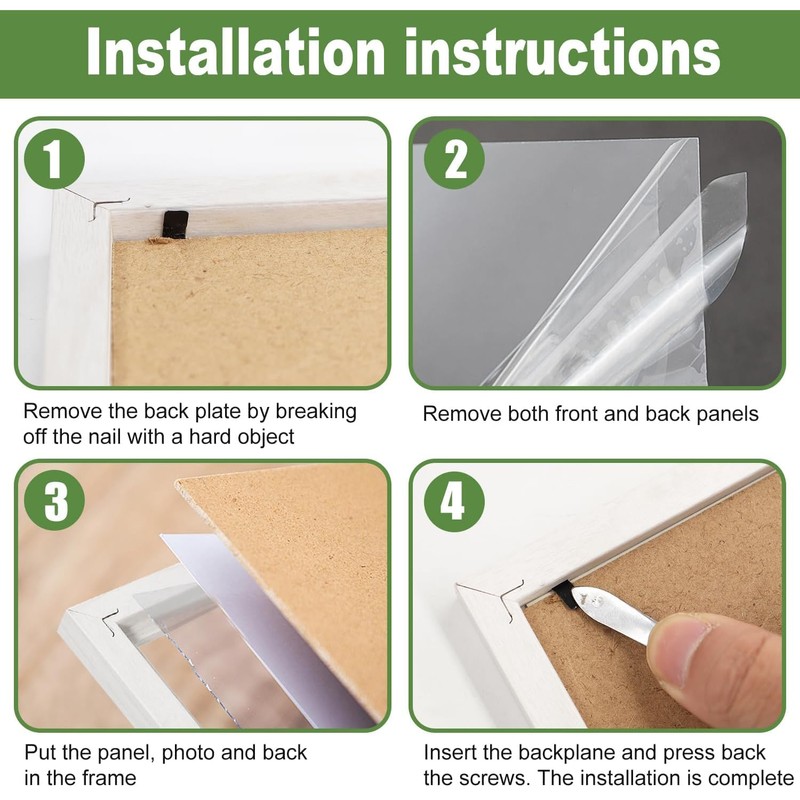 • Easy to Use: Open the pegs to take out the backing, panel, and cardboard, then tear off the protective film on the panel, and put in the photos in order. Photo frames can be used to store wedding photos, baby growth photos, friends, and family reunion photos, couple photos, anniversaries, festivals, and other important moments.