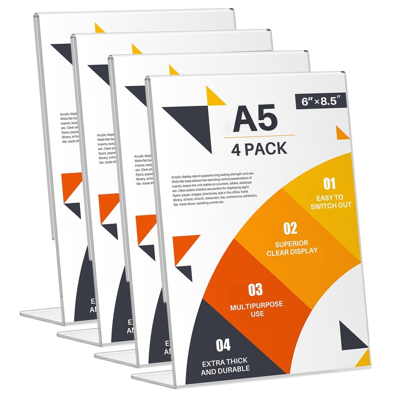 WenYa A5 Acrylic Sign Holder (4 Pack) - Slant Back Clear Tabletop Display Stand for Menus, Posters, Signage | L-Shape Countertop Frame for Office, Restaurant, Retail