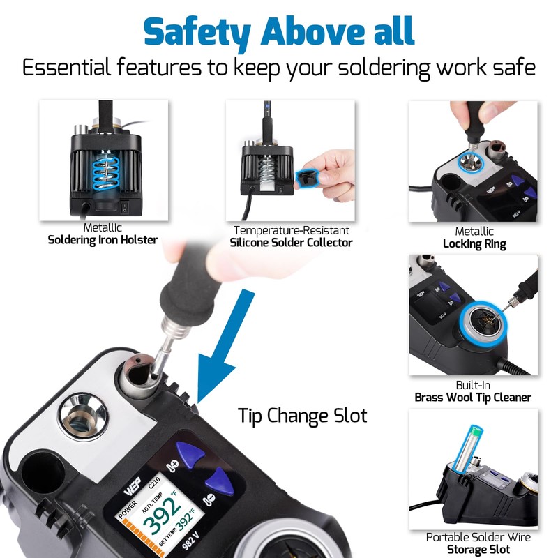 - Compact & Portable: this precision soldering station measures 6.30’’*3.11’’*3.15’’; its integrated main unit comes with soldering iron tip cleaner, metallic tip change slot for hot swapping, solder wire storage spot, solder iron holder and solder residue tray