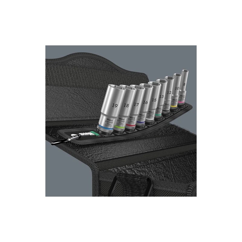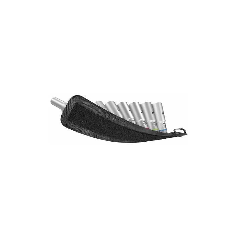 Robust textile belt in the typical wera design with 9 long 3/8″ manual and machine socket inserts (non-impacting) in a confined space. A smoother turning mechanism ensures a secure holding and easy removal of sockets. Includes snap hook for attaching to belt loops or bags. With fleece backing and hook and loop fastener strips for easy attachment e.G. On wall, shelf, workshop trolley or the wera 2go tool transport system. Long ⅜” manual and mechanical socket wrench inserts (iso 2725 part 3) from wera for use in manual and machine operation (non-impacting) even with low-lying screwdriving and protruding threaded rods. With “take it easy” tool finder with color coding by size – for easy and fast location of the required tool. Easy to grasp even with oily hands. With hexagonal profile and ball-catching groove. The hexagon profile allows the transmission of high forces and puts less strain on the edges of bolts or screw heads than a double hexagon profile. Fine-toothed ratchets also make the use of a double hexagon profile superfluous, even in confined spaces, thanks to their small back-pivoting angle. For external hexagonal bolts and sockets.