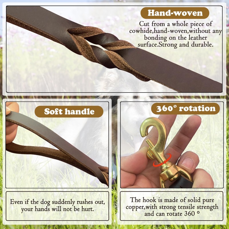 - 【Genuine Leather Braided Dog Leash】Made of high-quality first-layer cowhide, it is very durable and has strong control. The braided design at both ends effectively reduces the impact of your dog when it runs suddenly.