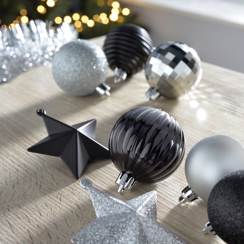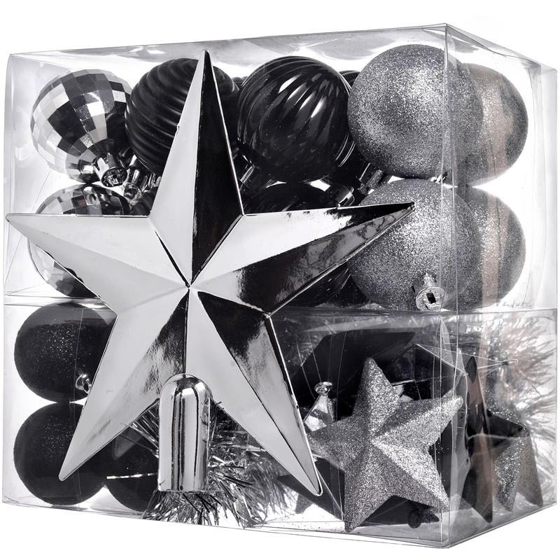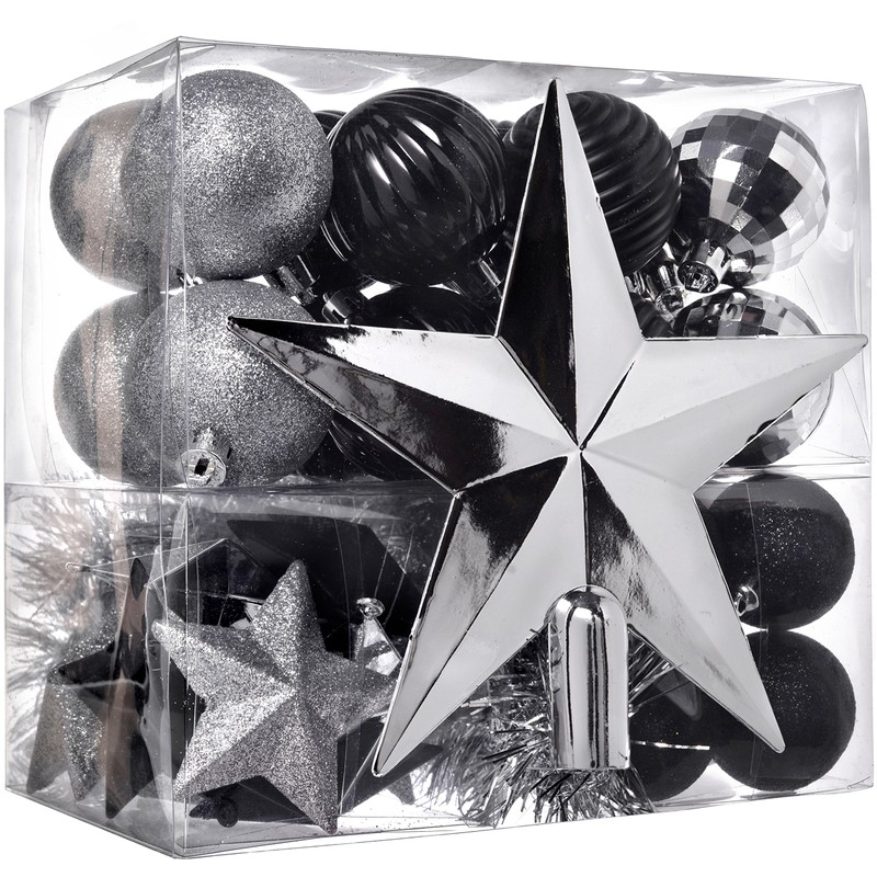 WeRChristmas 42-Piece Shatterproof Baubles Decoration Pack with Tree Topper & Garland - Silver / Black, Multi-colour
