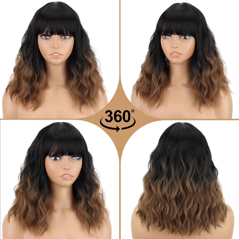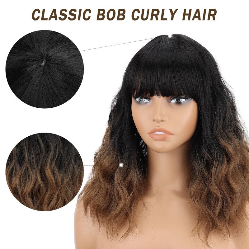 WERD Dark Brown Wig with Bangs Short Brown Bob Wavy Wigs for Women Synthetic Black to Brown Curly Wavy Wig for Daily Party Use (Black to Brown)