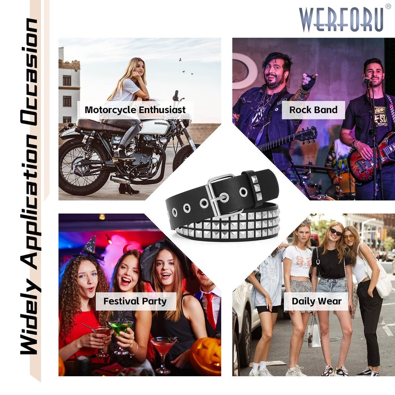 - Grommets Studded Belt: This belt equipped with silver buckle and three layers of metal rivets,very classic and fashionable. This leather belt will go well with any outfit, so the black belt is a great accessory for both men and women.