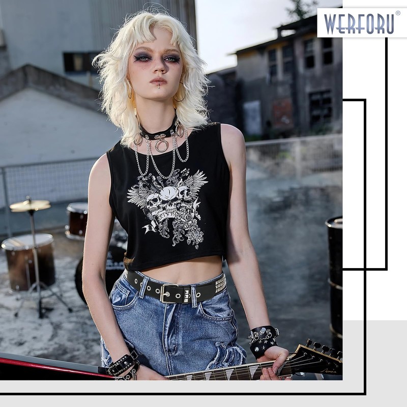 - Stylish Punk Belt: The double prong buckle really compliments the belt style and keeps the belt secure around your waist. The width of the buckle is about 1.97". Stylish square buckle match with studded grommet strap. This punk belt will easily give your stylish look. This belt is a great addition for any punk/goth/etc look for women.