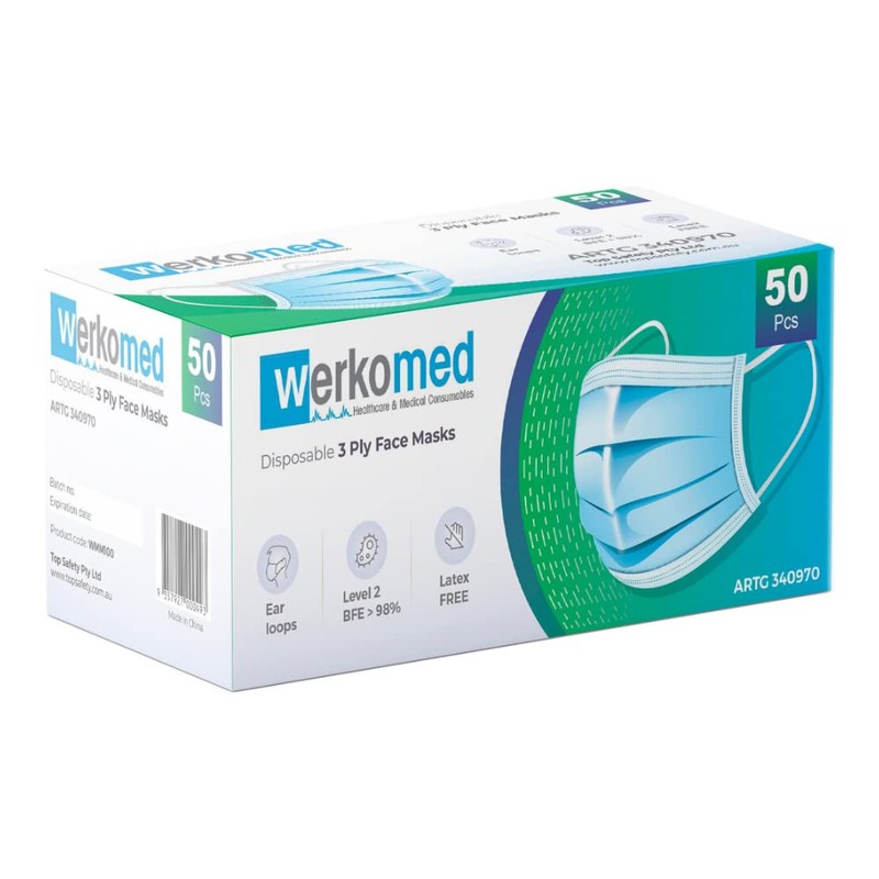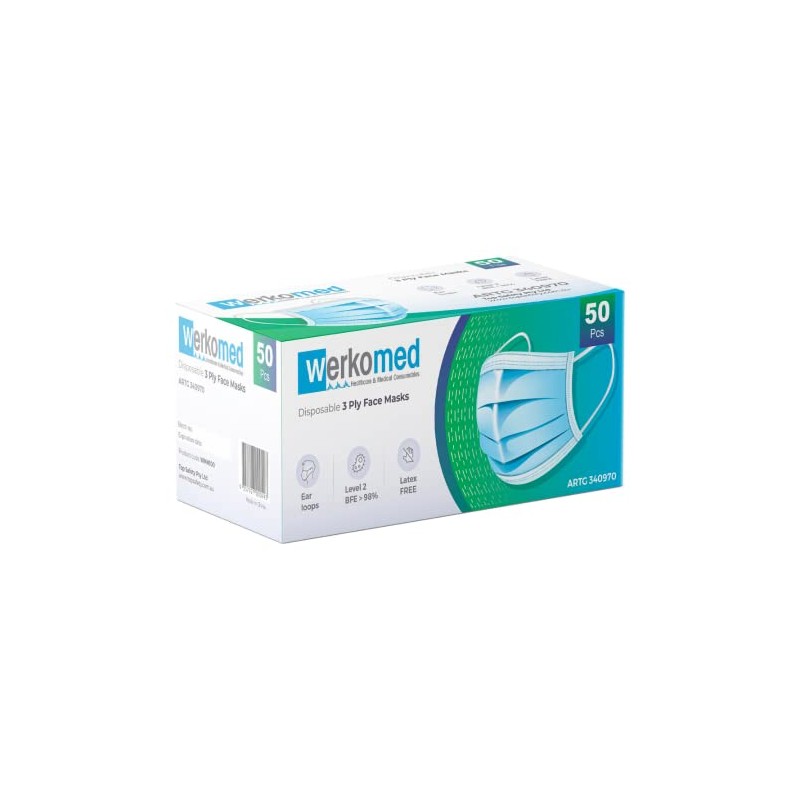 Werkomed Disposable 3 Ply Blue Face Masks 50 Pack - ARTG 340970
