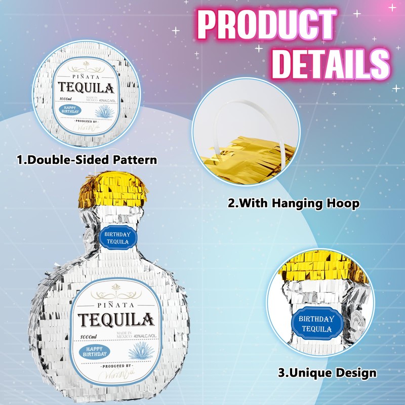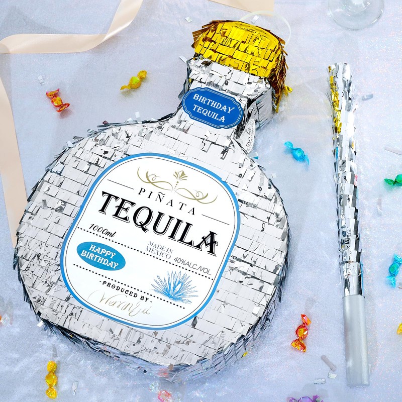 - TEQUILA PIÑATA - Bring sparkle and excitement to your event with our Silver Tequila Piñata. This piñata, shaped like a sleek tequila bottle with a shiny silver finish, adds a festive and fun touch to your party