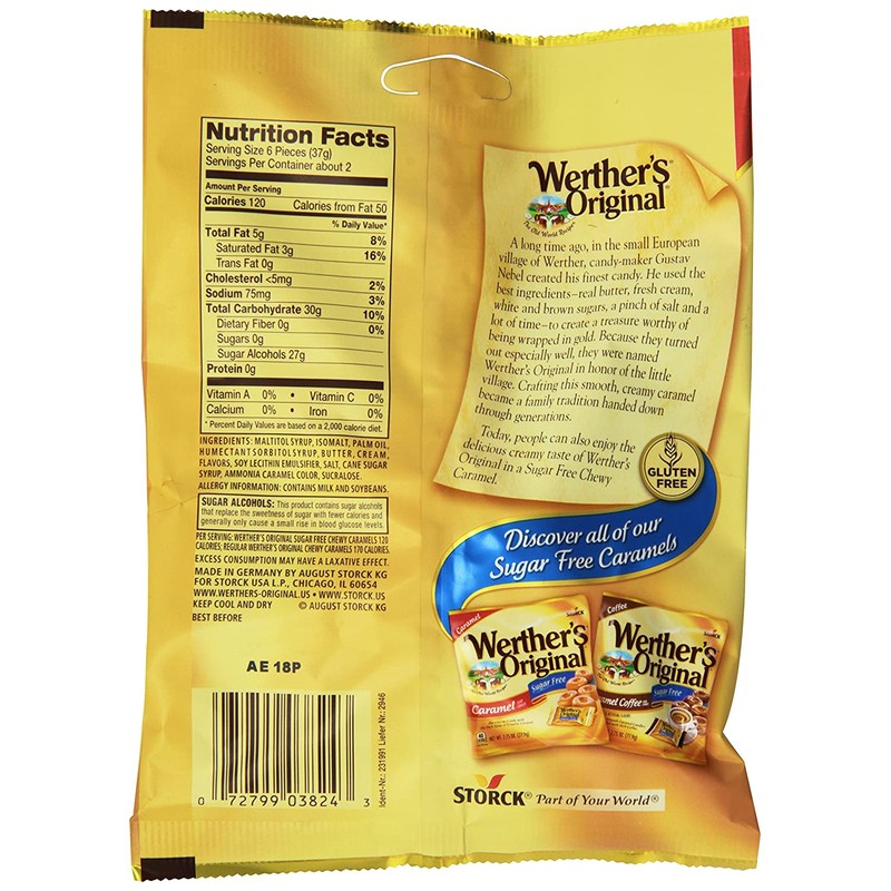 - WERTHER'S ORIGINAL SUGAR FREE CANDY: Enjoy the remarkable taste and creaminess of our WERTHER'S ORIGINAL chewy individually wrapped candy caramels without the sugar