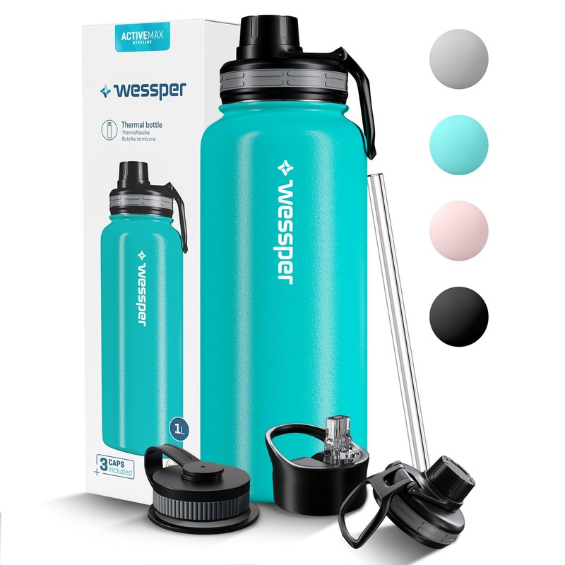 Wessper Stainless Steel Drinking Bottle, 1 Litre, Leak-Proof Thermos Flask, BPA-Free with 3 Lids, Marine Elegant Sports Water Bottle, Insulated Flask for Children, Adults, for Camping, Cycling,