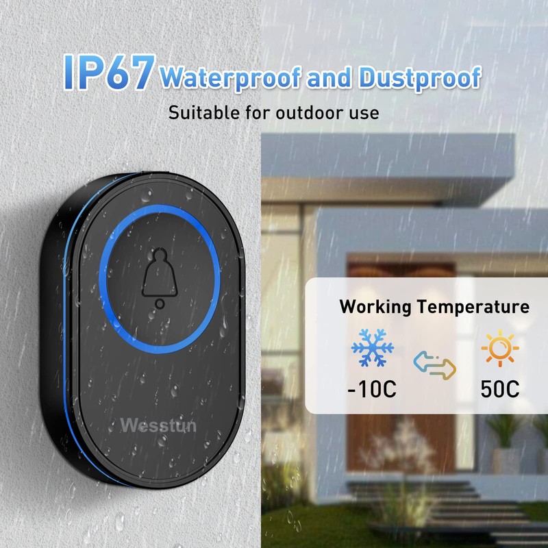 - [Safe & Reliable]: IP67 waterproof design ensures its good performance in the outdoor environment, the working temperature for the doorbell is from -10°C to 50°C. The plug in doorbell receiver uses the ABS flame retardant material to make sure the safety use of the receiver.