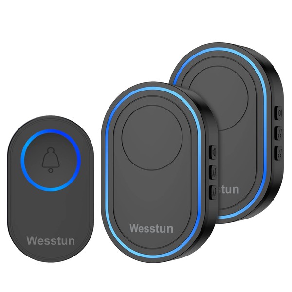 Wesstun Wireless Doorbell with 2 Receivers, IP67 Waterproof Door Chime Kit Operating at The Range of 300m, 2 Plug-in Door Bell Receivers with 39 Ringtones, LED Light & 5-Level Volume Control, Black
