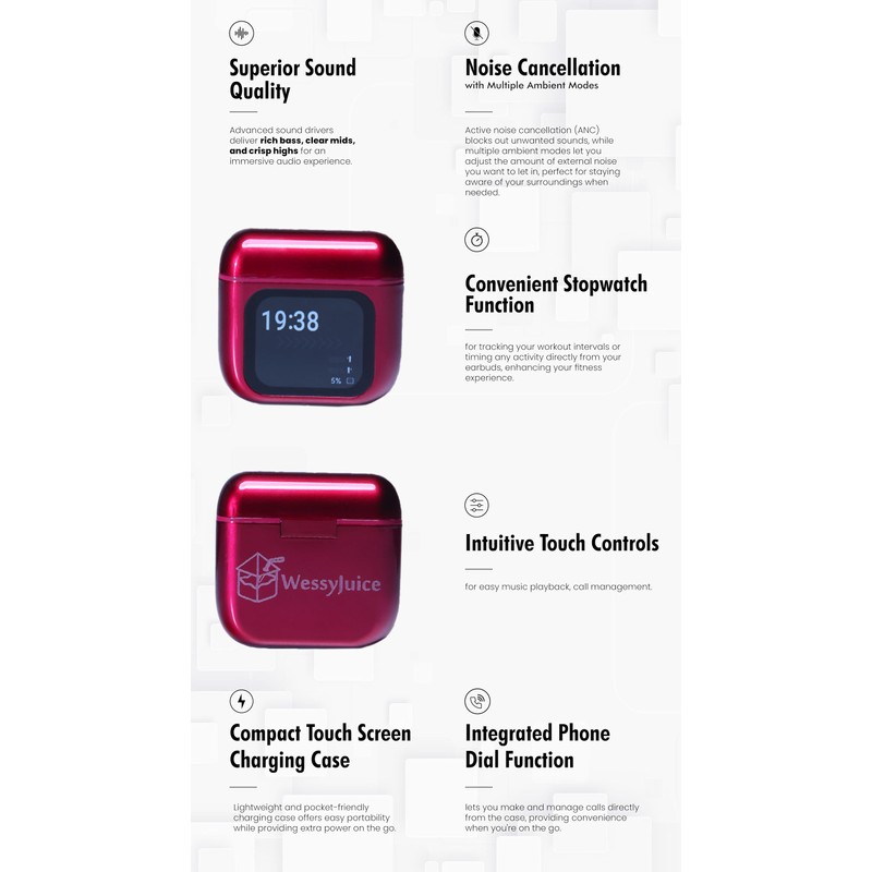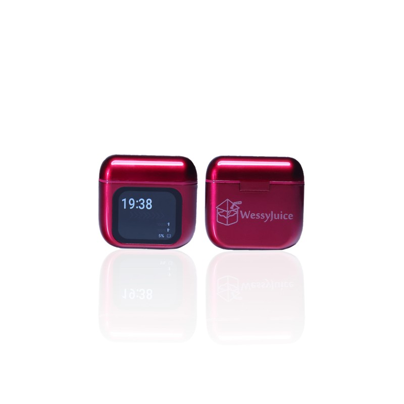 wessy juice wireless earbuds – Bluetooth, noise cancelling ear phones with multi use screen on case (red)