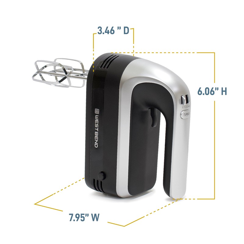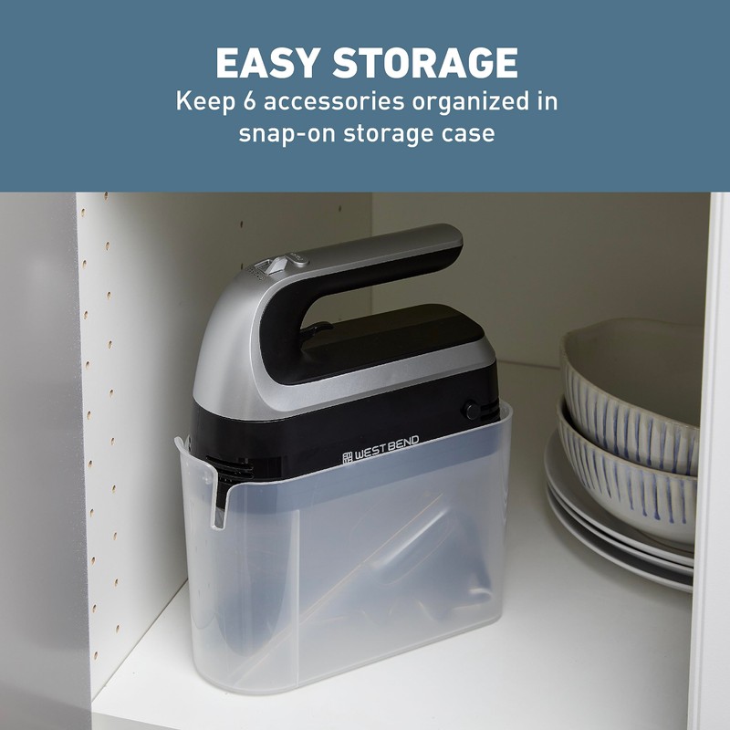 West Bend Hand Mixer Plus with Immersion Blender Attachment, 6 Speed Options with Ergonomic Handle and Snap-On Storage Case, 250-Watts, Black