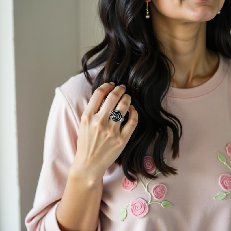 - Simple and chic, this attractive flower ring beautifully depicts an antiqued vintage finish steel rose in bloom