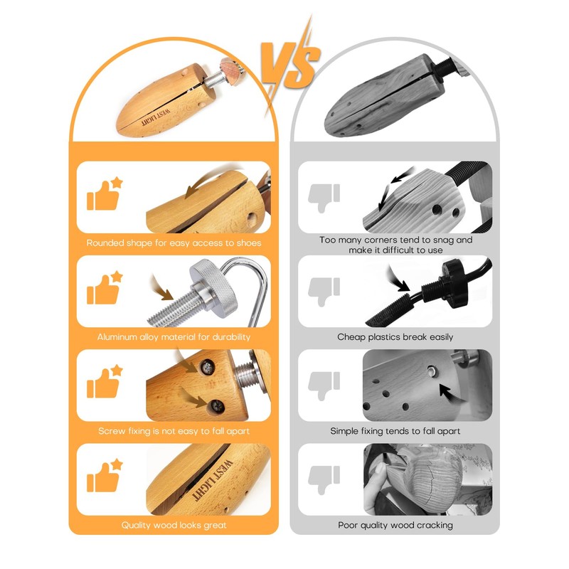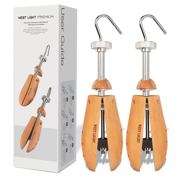 - SUBSTANTIAL UPHRADING OF MATERIALS: A good shoe stretcher is an investment that will last for. The WEST LIGHT Premium Professional Men's Shoe Stretcher is made of Beautiful beech hardwood with aluminum and metal handles and adjustable wheels. This shoe stretcher performs better than plastic shoe stretchers and can withstand more pressure without breaking.