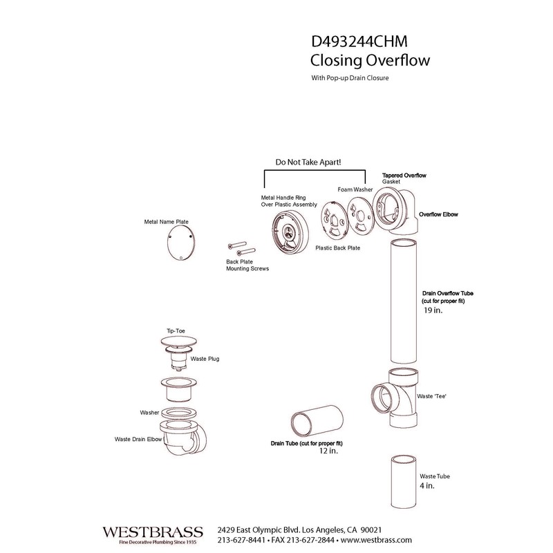 Westbrass Universal Deep Soak PVC Bath Drain, D493244CHM-26, Polished Chrome