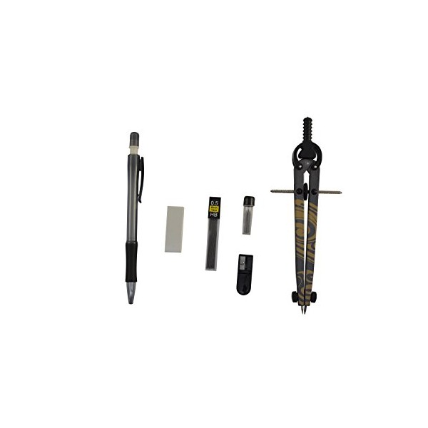 Includes compass, lead sharpener, eraser, 12 extra pencil leads, mechanical pencil, 4 extra compass leads, extra compass point