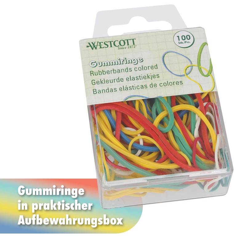 Westcott Rubber Bands 100 Pieces (Set of 3) | 3 x Colourful Rubber Rings Various Sizes in Practical Plastic Container | Storage Pack Household Rubber Diameter 20 mm - 70 mm | Min. 60% Natural Rubber |
