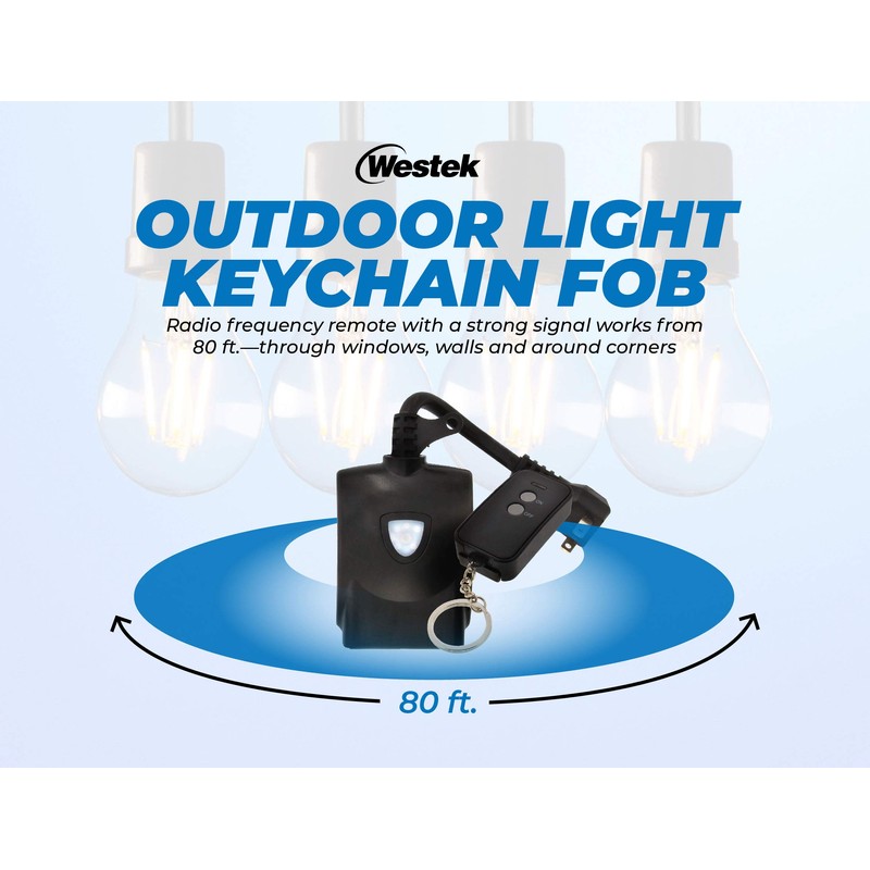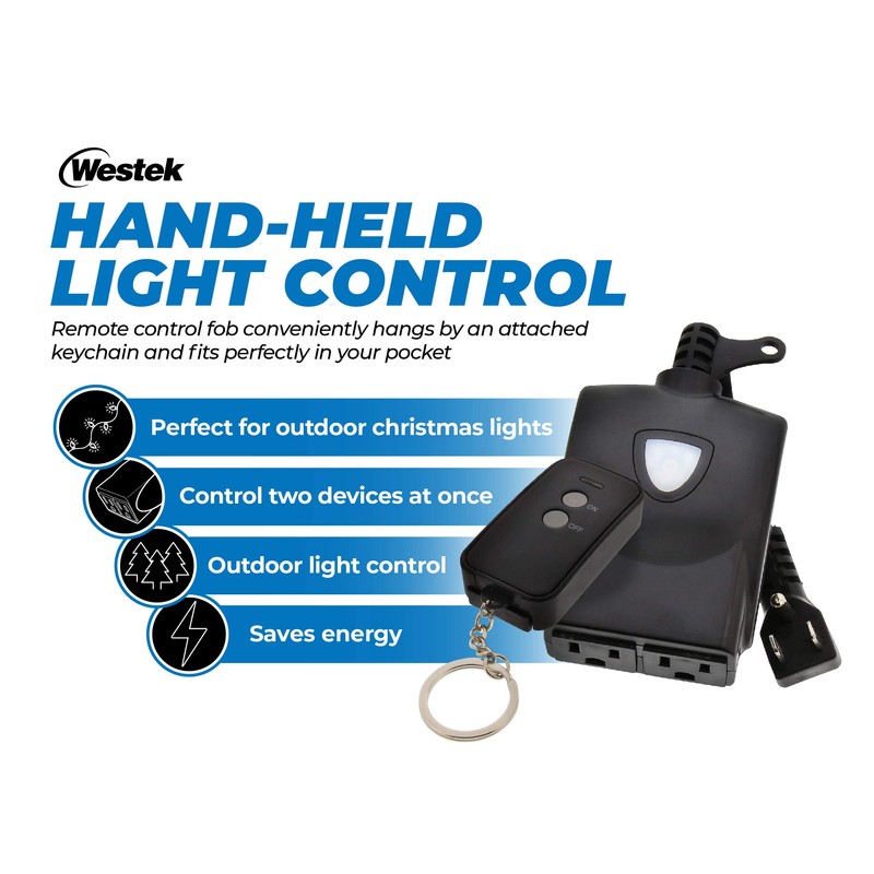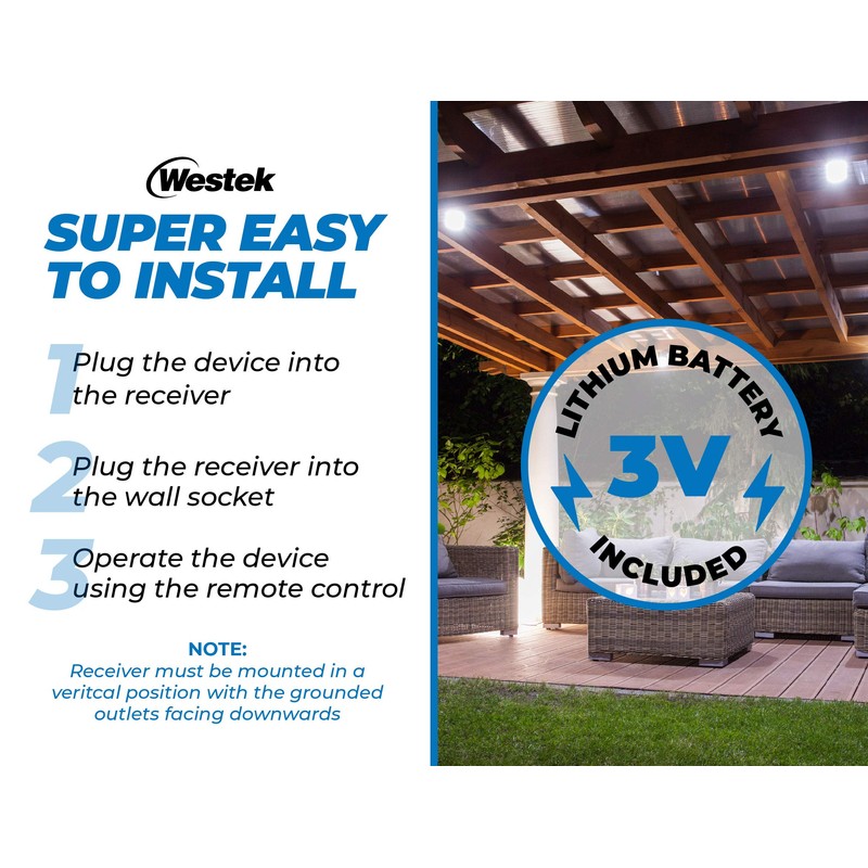Say goodbye to going outside in the rain to turn off your porch and patio lights. Or stubbing your toe in the dark trying to find the outdoor light switch. Instead, enjoy watching your frozen outdoor holiday decorations light up from the comfort of your cozy home. Or enjoy seeing your outdoor string lights and landscaping lights illuminate your backyard with just a push of a button. With the Westek Remote Control Receiver, all of this is possible. Westek puts you in control and helps you to operate both indoor and outdoor lights and electrical appliances without wires and at a distance, especially where the switches are hard to reach. This makes the kit ideal for the elderly and those who find it hard to reach or bend over. There are so many practical uses in and around your own home and back yard, you’ll wonder how you managed without it. Why not try it out to help you operate your hard-to-reach ceiling fan, heater, fountain, floodlight, tree lights, water features, sprinkler and pool pump – all without having to leave your house, maybe even without getting up from your chair. The handy remote control transmitter allows you to control devices wirelessly from any distance less than 80 feet and it even works through doors, windows and around corner. It is discrete so it won’t get in your way and features just two buttons (‘on’ and ‘off’) for simplicity. It also has a keychain so that it can be attached to your key set or easily hung from a hook so that it is right at your fingertips when you need it. The controller comers with a pre-installed 3v lithium battery. Easy to install and requiring no tools, plug your device into one of the 2 grounded outlet plugs and then plug the weatherproof receiver into the wall outlet. Operate the devices from up to 80 feet away using the remote control. Please note that the outlet is weatherproof and rain tight, however must be mounted in a vertical position with the sockets facing downward, at least 2 feet above ground level.