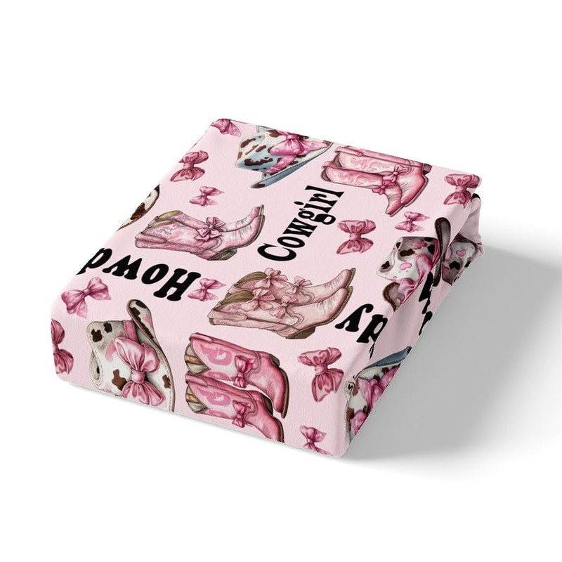 Western Cowgirl Bed Sheet Set Princess Bowknot Kawaii Pink Bow-tie Sheet Sets Deep Pocket(No Flat Sheet),Rustic Cowhide Print Cowgirl Boots Cap Mattress Cover,Twin with 1 Pillowcase
