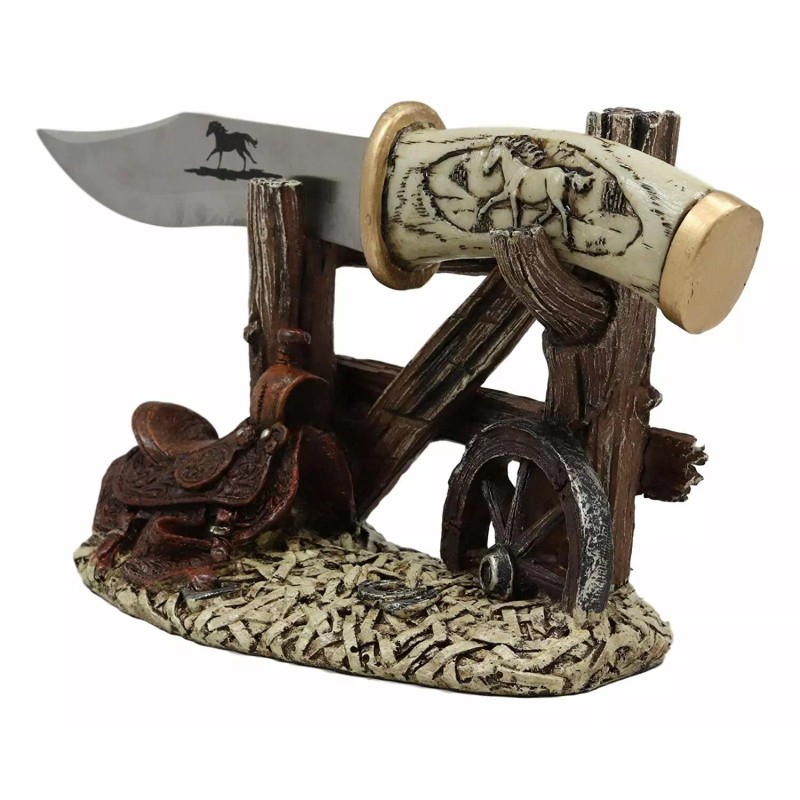 Western Horse Saddle By Wagon Wheel With Blunt Knife Display Holder Statue Set